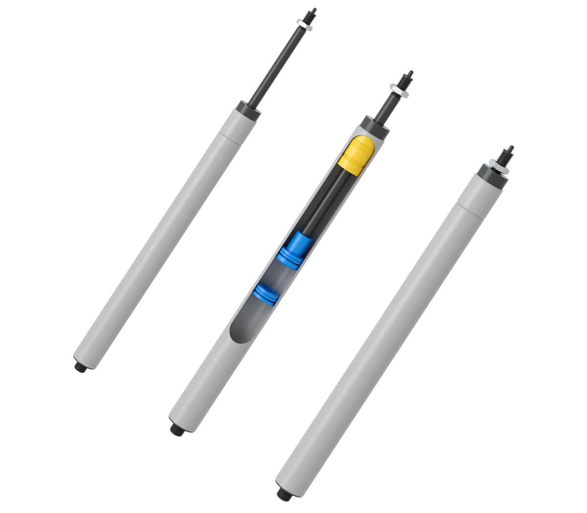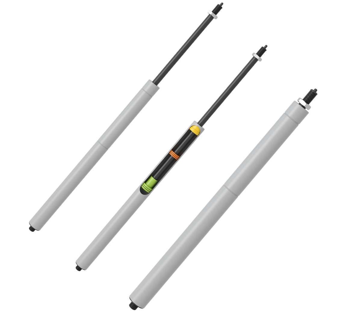 引張方向で剛性ロックが可能な設計です。ガスチャンバーの容積が小さいため、圧縮方向のロック力が相対的に大きく、安定した固定を実現します。フローティングピストン(浮動ピストン)の位置により弾性比を調整できる構造を採用しています。一定のチューブ長に対してストロークはやや短めですが、角度・高さ・水平位置の調整を行う装置で、引張方向での高剛性ロックを求める用途に最適です。両端には多様なマウント方式を選択可能です。